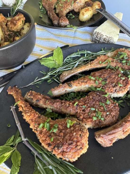 March 28, 2024 Panko & Pecorino Crusted Lamb Chops and Roasted Garlic Cheesy Baby Potatoes Main Courses